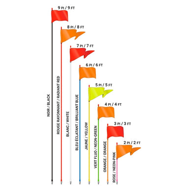 100% Oxford polyester orange safety flag mounted on a flexible 3/8" fiberglass rod. The colorful PVC shrink tubing protects each rod from sun-spli...