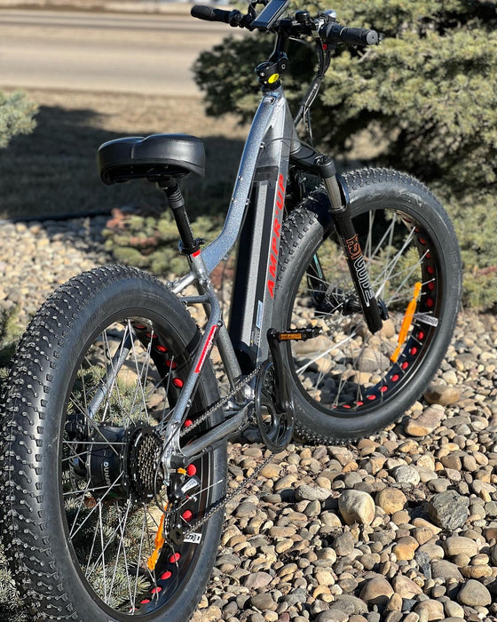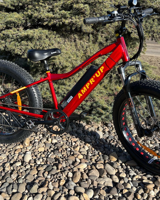 This Ampr'up 2.0 fat tire E-bike is loaded with features at a great value. Whether you're charging down your favorite trail or commuting to work, this bike has all the options to make your ride more enjoyable. If you haven't thrown a leg over one of these bikes... you need to! Even the biggest skeptics come back smiling. They are a blast and can be ridden everywhere a pedal bike is allowed. Even the national parks are encouraging e-bikers on their trail systems. The Ampr'up 2.0 is equipped with a larger capacity 16Ah battery so you spend less time charging and more time riding. With a 32kph top speed to get you there on time and Tektro hydraulic disc brakes to stop on a dime. Front suspension forks and fat tires provide an amazingly smooth ride while a new comfier seat design lets you spend more time in the saddle. The traction and flotation from the fat tires are simply impressive, mud, sand or snow go almost anywhere and stay clean with removable fenders. Super low first gear with 9 different assist levels gives you the confidence to power through the most challenging obstacles. You may have snickered at the guy riding through the snowdrifts in the middle of February, but it's a great way to make winter more enjoyable.