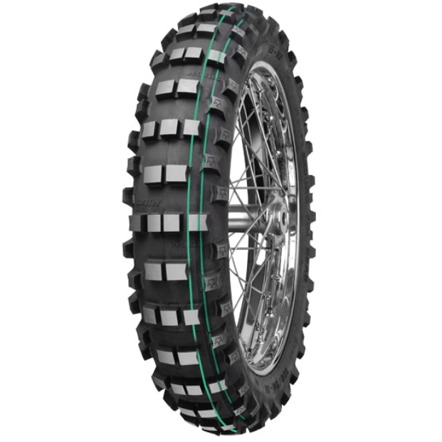 The Mitas EF07 Super soft tire (marked with two green stripes) is a rear tire combining an enduro-style lug placement and ultra-sticky soft compound for the most demanding extreme conditions. The tire is best suited for rocky, wet, muddy terrains and steep climbs, it was designed with extreme enduro races in mind. Its significantly enhanced carcass and extra soft compound are ideal for all terrains and offer an excellent grip.