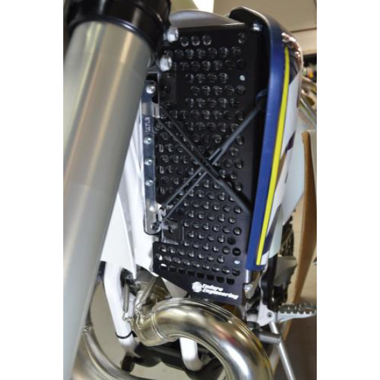 Enduro Engineering radiator guards protect the front of your KTM & Husqvarna radiator from an impact or flying debris. They are made from 3/16" aluminum with support rods welded on to attach to your EE radiator Braces. Finished off with black anodizing for a factory look and easy cleanup.